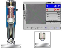 TIV(通過壓痕觀察)法是建立在維氏硬度檢測之上的;此方法通過特殊的光學(xué)方法“看穿” 維氏金剛石。,青島超聲波硬度計(jì),當(dāng)探頭壓人在材料的同時,壓痕的圖片就被直接、自動并迅速地進(jìn)行傳輸和評估,儀器通過壓痕,讀出測量結(jié)果。