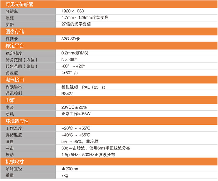 產(chǎn)品特點 體積小重量輕 直徑200mm,小型紅外熱像儀,重量7kg,filr 紅外熱像儀,大大降低飛機有效負荷 連續(xù)變焦高清可見光攝像機 配置27倍連續(xù)變焦1920×1080P的高清可見光攝像機,成像質(zhì) 量高,紅外熱像儀檢測,可呈現(xiàn)高清場景,新一代紅外熱像儀,便于精確定位故障 跟蹤精度高穩(wěn)定性好 采用陀螺穩(wěn)定平臺,可有效隔離運動載體的各種振動、起伏、 顛簸,消除圖像的模糊和晃動 視頻實時回傳 高空視頻可實時回傳至地面指揮中心,紅外熱像儀品牌,提高巡線效率 可拍照錄像 配置32G內(nèi)存卡,可對觀測點拍照錄像,美國flir紅外熱像儀,便于地面對故障進行分析