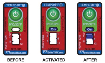 TempDot™Plus標簽應存儲在室溫下,并必須在反應溫度閾值以上被激活。激活是通過用手指推壓。"On"字出現(xiàn)在第一個窗口中顯示激活。之后5分 鐘內(nèi),在反應溫度或低于反應溫度的情況下將標簽貼到產(chǎn)品上。藍色染料熔化并以控制的速率遷移,,經(jīng)過白色大窗口。這表示暴露在溫度閾值以上的累計時間。當溫 度低于閾值時,該染料固化并停止移動。如果溫度超過閾值,TempDot®Plus標簽提供即時的視覺跡象。