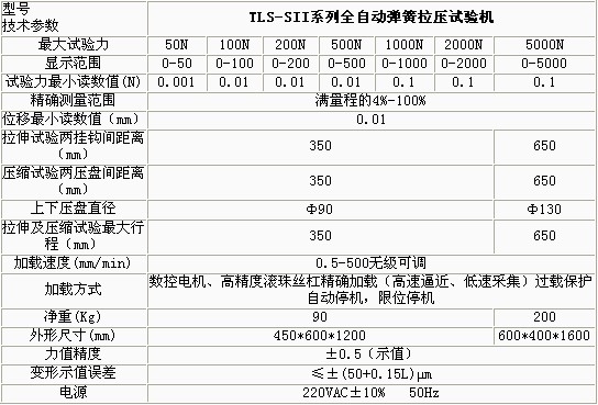 產(chǎn)品概述: TLS-SII系列全自動(dòng)數(shù)顯式拉壓試驗(yàn)機(jī)是適用于拉壓試驗(yàn)的新型試驗(yàn)設(shè)備。試驗(yàn)機(jī)主機(jī)的設(shè)計(jì)具有外形美觀、操作方便、性能穩(wěn)定可靠的特點(diǎn)。試驗(yàn)機(jī) 采用數(shù)控電機(jī)及先進(jìn)的單片機(jī)控制技術(shù)加載及控制,能實(shí)現(xiàn)雙速預(yù)置。實(shí)現(xiàn)了高速逼近,低速采集。提高了測試精度,彈條疲勞試驗(yàn)機(jī),保證了試驗(yàn)效率。 功能特點(diǎn): 自動(dòng)變速檢測5個(gè)測試點(diǎn),并自動(dòng)返回到試驗(yàn)初始位置 LED顯示,彈簧壓縮試驗(yàn)機(jī),人機(jī)對話直觀明了便于操作 可以選擇多種測試方法,順次自動(dòng)完成一批工件的測試,空氣彈簧試驗(yàn)機(jī)廠家,可查看已測數(shù)據(jù) 傳感器引起的變形量可以補(bǔ)償,既傳感器和整機(jī)剛度引起的變形不影響位移精度。 可實(shí)現(xiàn)試驗(yàn)力、試驗(yàn)速度、位移等多種控制方式,具有以下功能: 設(shè)定變形量F,檢測彈簧的試驗(yàn)力P; 設(shè)定彈簧的剩余高度H,檢測彈簧的試驗(yàn)力P; 彈簧變形的檢測已工作壓盤接觸彈簧為準(zhǔn),此時(shí)試驗(yàn)力有反應(yīng),試驗(yàn)力(初始力)的大小任意設(shè)定。 技術(shù)參數(shù):