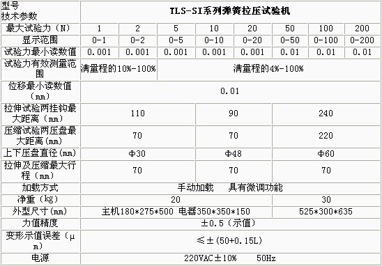 產(chǎn)品概述: TLS-SI系列雙數(shù)顯示拉壓彈簧試驗(yàn)機(jī)采用集成電路、微機(jī)技術(shù)對(duì)位移、試驗(yàn)力兩參數(shù)進(jìn)行電子檢測(cè)、數(shù)字顯示并對(duì)試驗(yàn)結(jié)果進(jìn)行打印。施加試驗(yàn)力為手動(dòng),還可以對(duì)負(fù)荷傳感器位移作自動(dòng)修正。,適用于各種精密拉伸和壓縮螺旋彈簧試驗(yàn)機(jī)及對(duì)脆性材料的強(qiáng)度測(cè) 功能特點(diǎn): 數(shù)字顯示位移、負(fù)荷,小型彈簧疲勞試驗(yàn)機(jī),精確直觀并對(duì)試驗(yàn)結(jié)果進(jìn)行打印 采用ISP技術(shù)編程,全自動(dòng)彈簧拉壓試驗(yàn)機(jī),對(duì)負(fù)荷傳感器的變形自動(dòng)修正 試驗(yàn)力、位移任意點(diǎn)清零,彈簧測(cè)試儀,可任意設(shè)定檢測(cè)基準(zhǔn) 具有峰值保持、過載保護(hù)等功能 技術(shù)參數(shù):