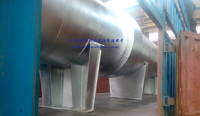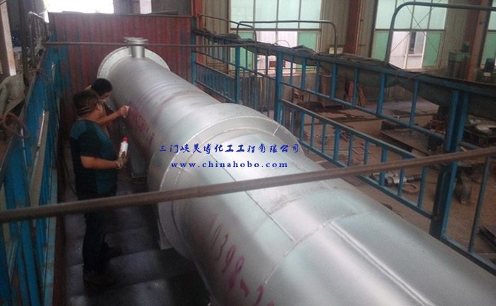 操作人員在換熱器設(shè)備上打上三門峽昊博化工工程有限公司標示和電話0398-2918156