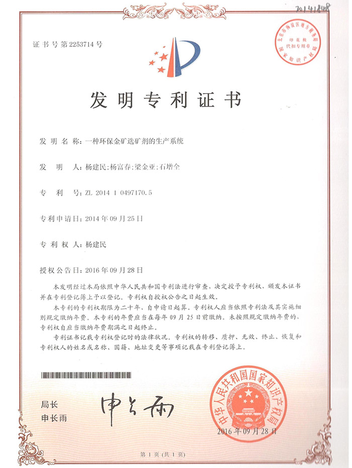 熱烈祝賀我公司又取得一項專利《一種環(huán)保金礦選礦劑的生產(chǎn)系統(tǒng)》