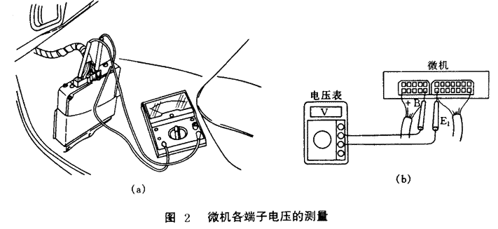 。4)必須在微機(jī)和線(xiàn)束連接器(插頭)處于連接的狀態(tài)下測(cè)量微機(jī)各端子的電壓并且萬(wàn)用表的測(cè)筆應(yīng)從線(xiàn)束插頭的導(dǎo)線(xiàn)一側(cè)插入進(jìn)行測(cè)量微機(jī)各端子的電壓(如圖 2所示)。