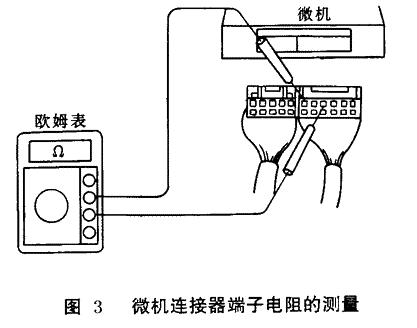 。3)如圖 3所示用萬(wàn)用表歐姆檔測(cè)量導(dǎo)線(xiàn)連接器各端子間電阻值(注意:不要觸碰微機(jī)的接線(xiàn)端子應(yīng)將測(cè)筆從導(dǎo)線(xiàn)側(cè)插入導(dǎo)線(xiàn)連接器中)。