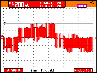 50 Hz馬達(dá)驅(qū)動(dòng)輸出電壓的脈寬調(diào)制信號的細(xì)節(jié)。1000V,50 微秒的脈沖即導(dǎo)致某些測試設(shè)備的不穩(wěn)定。