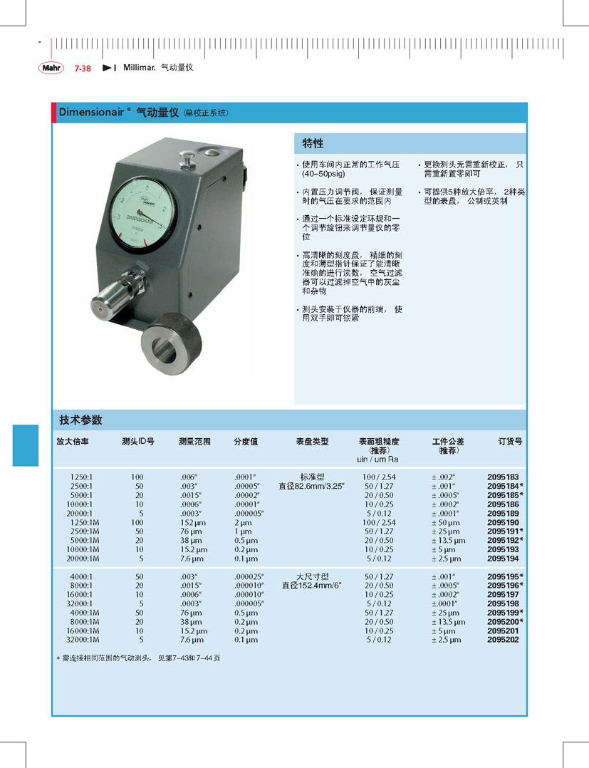 Mahr Federal Dimensionair 氣動量儀是氣動量儀中特有的一個類型。屬于差壓式氣動量儀,活塞式壓力計生產(chǎn)廠家,它的優(yōu)點在于能提供一個合適的放大倍率和平衡的氣動系統(tǒng)。一個線性的、準確的校正比例為刻度的劃分、讀數(shù)提供了條件。 馬爾Dimensionair氣動量儀相比于其他氣動量儀具體更大的測量范圍。以保證氣動測量頭與工件表面有足夠大的初始距離。大的測量頭的間隙減少了磨損,揚壓力計算公式,延長了使用壽命。