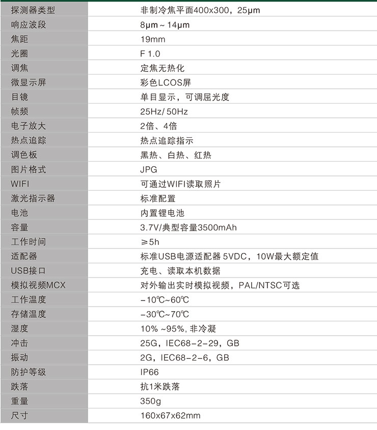 產(chǎn)品特點(diǎn) 可拍照,法國(guó)紅外熱像儀,并通過(guò)WIFI分享所拍攝照片,熱像儀,方便多人同時(shí)瀏覽 直觀的按鍵功能操作,防爆紅外熱像儀,無(wú)需培訓(xùn),紅外熱像儀 報(bào)價(jià),符合人體工學(xué)設(shè)計(jì),長(zhǎng)期使用依 舊舒適 超靜音和防漏光設(shè)計(jì),國(guó)產(chǎn)紅外熱像儀,使用時(shí)不暴露自身 內(nèi)置式鋰電池,5小時(shí)超長(zhǎng)電池使用時(shí)間,并可外接便攜電源持續(xù)使用 標(biāo)準(zhǔn)Micro USB充電接口,新一代紅外熱像儀,適應(yīng)多種充電方式(適配器/車(chē)載點(diǎn)煙器/電腦/充 電寶) 激光指示器可用于目標(biāo)指示 IP66超強(qiáng)防護(hù)等級(jí),抗1米跌落,適應(yīng)野外使用環(huán)境