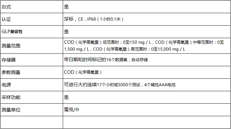 該儀器具有大屏幕背光顯示屏,,實(shí)時(shí)時(shí)鐘,,自動(dòng)數(shù)據(jù)記錄功能,,具有可以使用900系列數(shù)據(jù)集線器將數(shù)據(jù)導(dǎo)出到計(jì)算機(jī)或打印機(jī),,或者進(jìn)行紅外數(shù)據(jù)傳輸?shù)墓δ。能夠快速?zhǔn)確地測(cè)量COD(化學(xué)需氧量)的910比色計(jì)的特點(diǎn)包括: •自動(dòng)數(shù)據(jù)存儲(chǔ)功能;能夠存儲(chǔ)具有日期和時(shí)間標(biāo)記的16個(gè)數(shù)據(jù)集 •大型背光LCD顯示屏 •IP68防水外殼;易于固定或放置在臺(tái)面上;可漂浮 •遮光罩,,可防止容易損壞或丟失的移動(dòng)部件或單獨(dú)部件的移動(dòng) •可以根據(jù)特定的范圍要求,,提高分辨率 •可以針對(duì)采樣過(guò)程對(duì)于已知的干擾進(jìn)行調(diào)整 •自動(dòng)關(guān)閉功能 •2年保修期