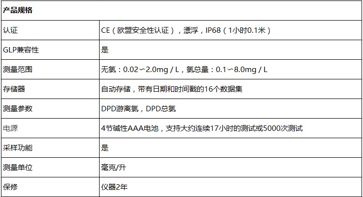 900測量儀的特點時可以快速準確地測量游離氯或總氯含量: •自動數(shù)據(jù)存儲功能;能夠存儲具有日期和時間標記的16個數(shù)據(jù)集 •大型背光LCD顯示屏 •IP68防水外殼;易于固定或放置在臺面上;可漂浮 •遮光罩,,可防止容易損壞或丟失的移動部件或單獨部件的移動 •用戶校準功能 •可以根據(jù)特定的范圍要求,,提高分辨率 •可以針對采樣過程對于已知的干擾進行調(diào)整 •自動關(guān)閉功能 •2年的保修期